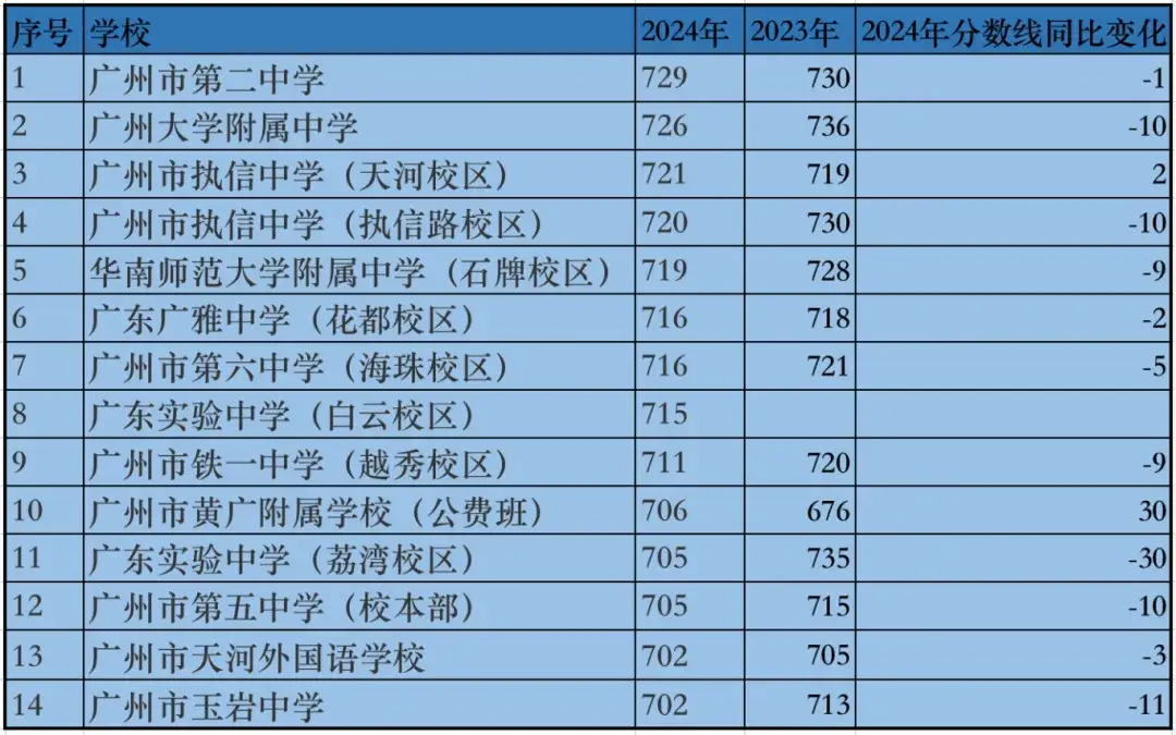 Ranking of scores of leading schools in the Guangzhou High School Entrance Examination third batch in 2024 and comparison of the situation in 2023