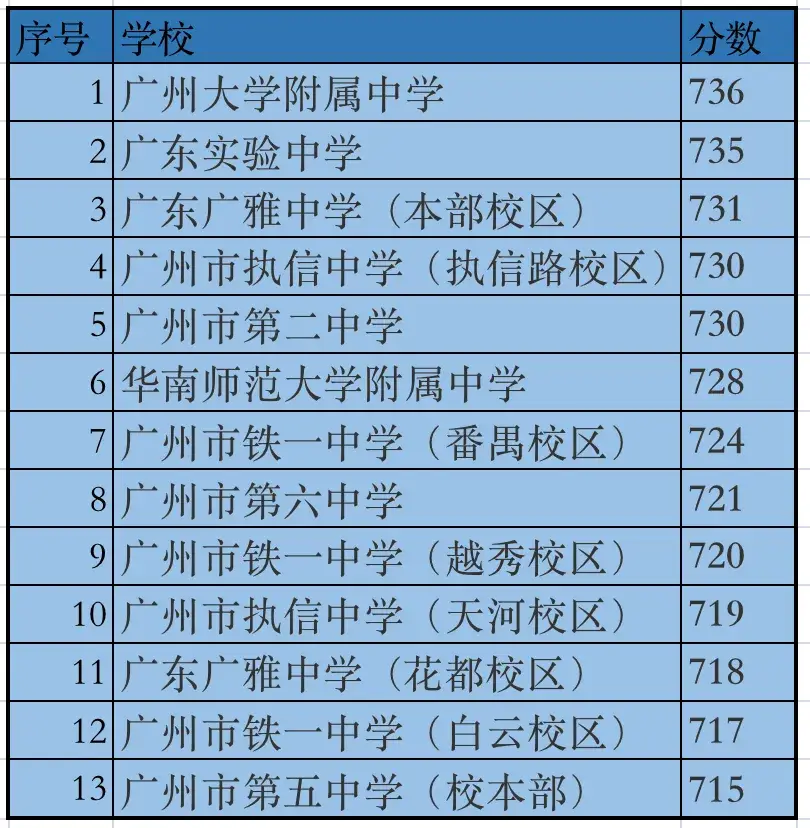 No. 2 Middle School (729 points), Guangda Middle School (726 points), Zhixin Tianhe (721 points), Zhixin Yuexiu (720 points), Huafu Shipai (719 points), Guangya Huadu (716 points), No. 6 Middle School Haizhu (716 points), and Provincial Shibai Yun (715 points), Tieyi Yuexiu (711 points), Huangguang Affiliated School public-funded class (706 points), Provincial Shiliwan (705 points), No. 5 Middle School Headquarters (705 points), Tianhe Foreign Language (702 points), Yuyan (702 points).