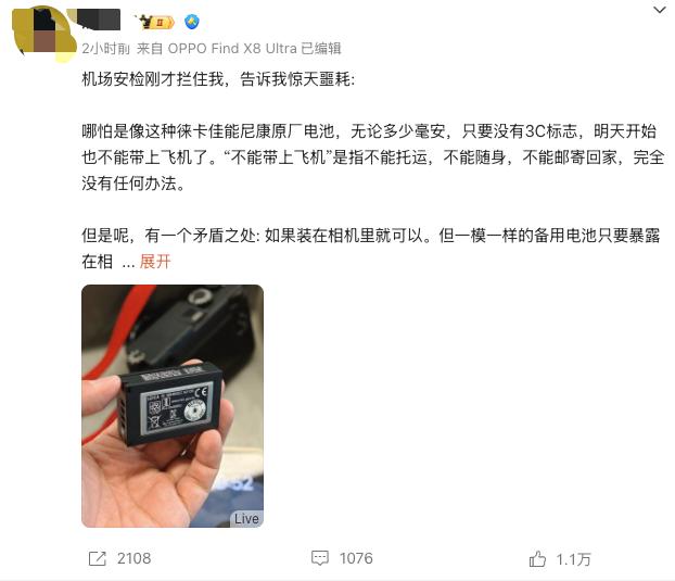 On June 27, a netizen posted on Weibo that he learned during the security check at Shanghai Hongqiao Airport that camera batteries, regardless of their capacity, as long as they do not have the 3C mark, will not be allowed to be brought on board the plane starting from the 28th. However, the reporter left a message to the netizen expressing his willingness to be interviewed, but as of the time of publication, no reply had been received.