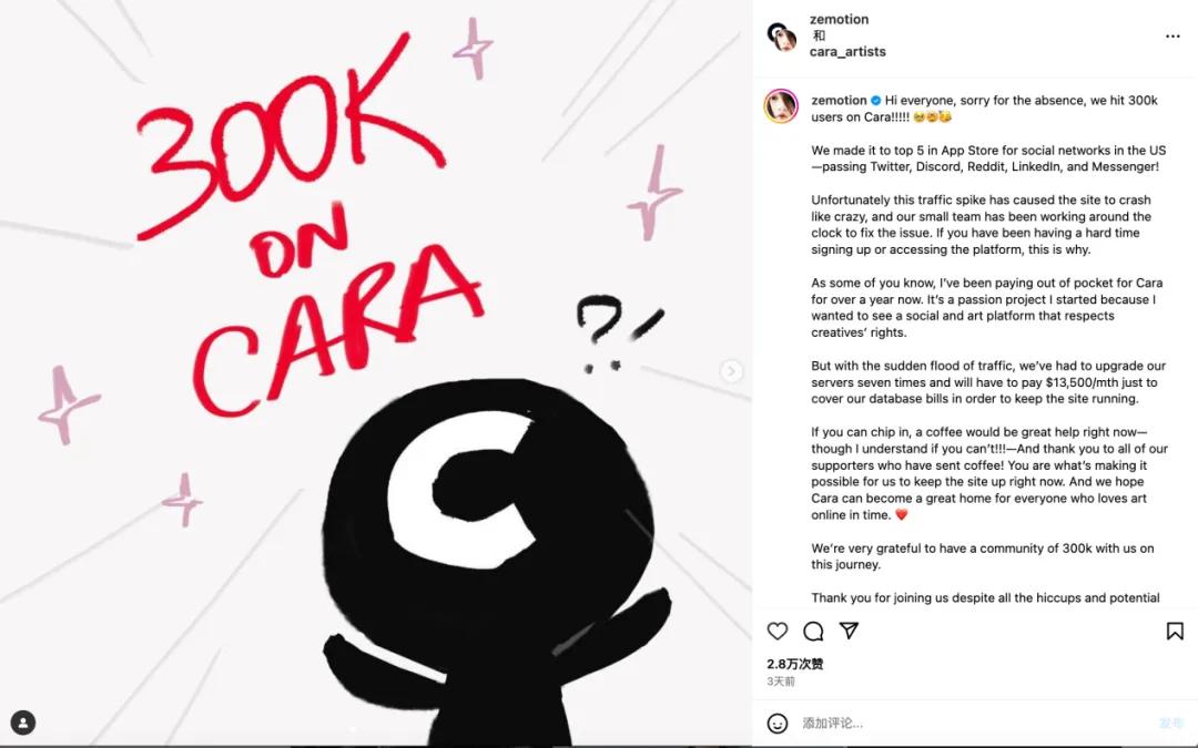 (2) As of now, except for voluntary rewards from users who “buy a cup of coffee”, Cara has not set up a monetization method. If it wants to continue operating, it must either make money or raise money;