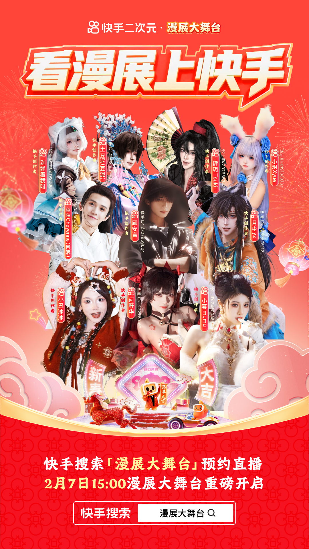 The Spring Festival is a traditional festival for family reunion, and it is also a golden moment when youth culture and folk rituals collide. During the Spring Festival of the Year of the Horse in 2026, Kuaishou will use the two core activities of the 2D New Year Party and the Comic Exhibition Grand Stage to create an online and offline Kuaishou 2D New Year Party. It will use voice actor feasts, Chinese-style golden songs, live comic exhibition scenes, and COS shows to present an exclusive "electronic New Year's Eve dinner" to 2D users, redefining the sense of the 2D New Year ritual with youthful expressions.